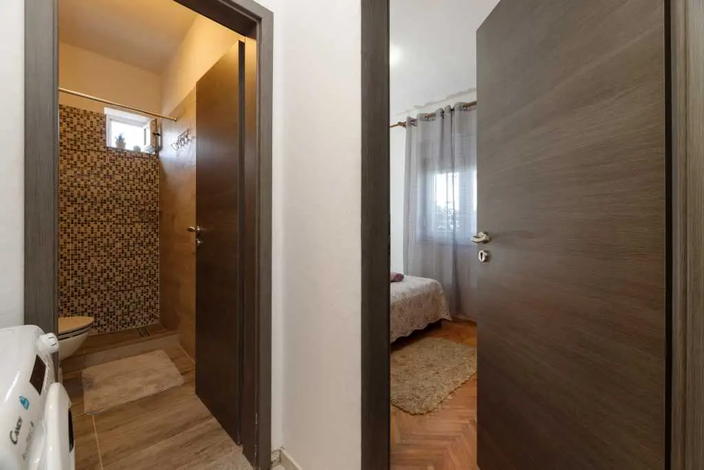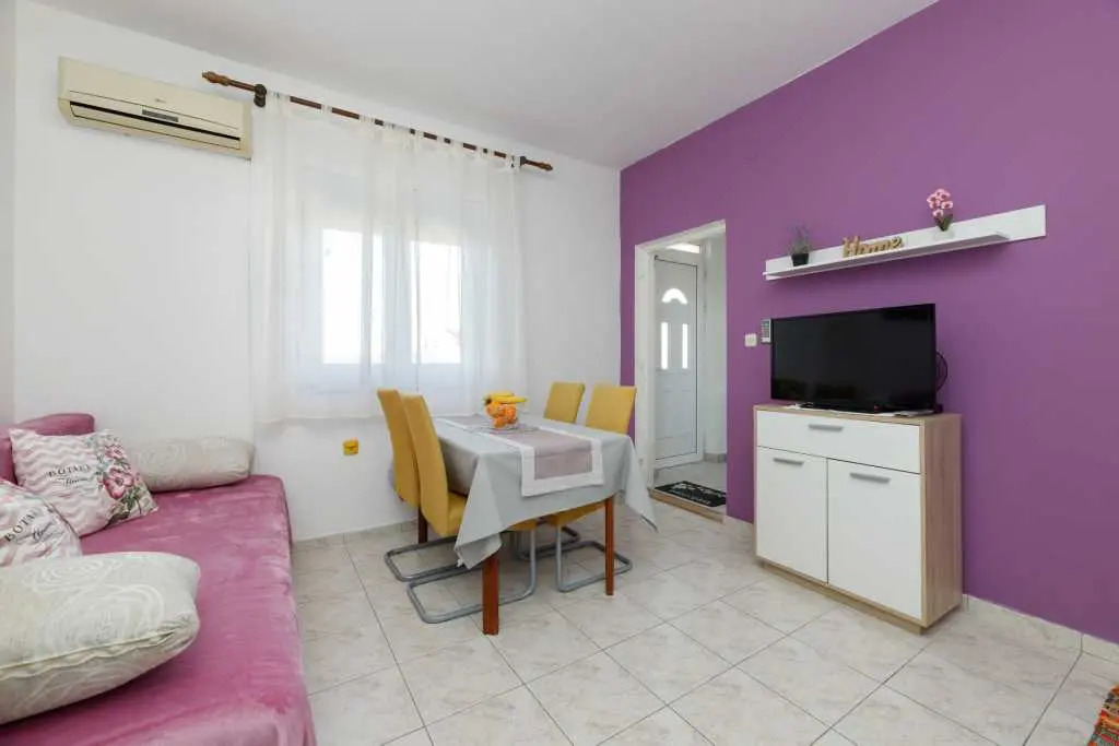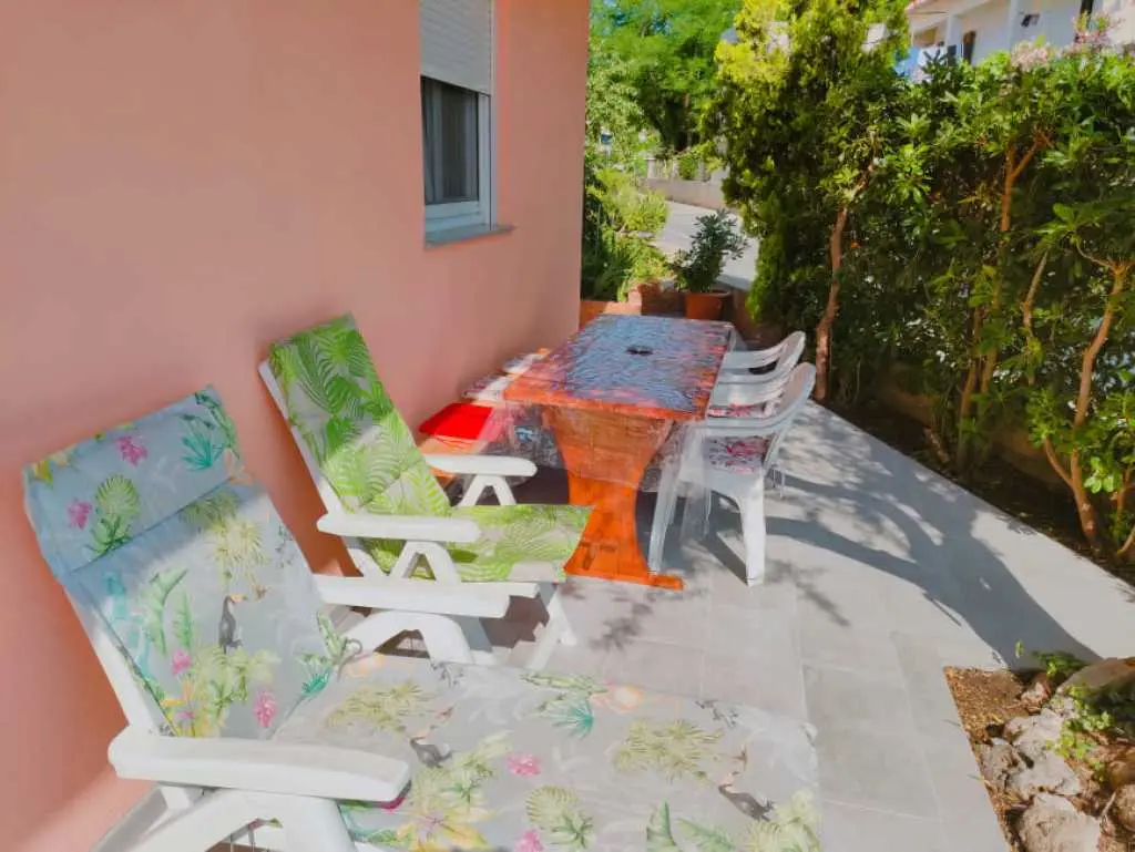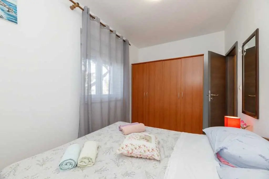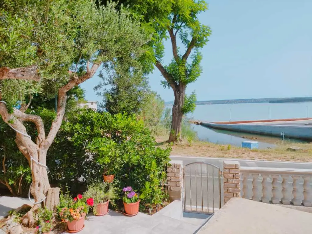 Jednopokojový apartmán Pandula na ostrově Tkon Pašman, 2+2 osoby, má dvoulůžkovou postel v pokoji a pohovku v jídelně, plus jednu extra, 20 m od pláže, terasa s výhledem na moře, pračka a myčka, trouba v kuchyně, soukromé parkoviště, klimatizace, gril, wi-fi, je to v přízemí.