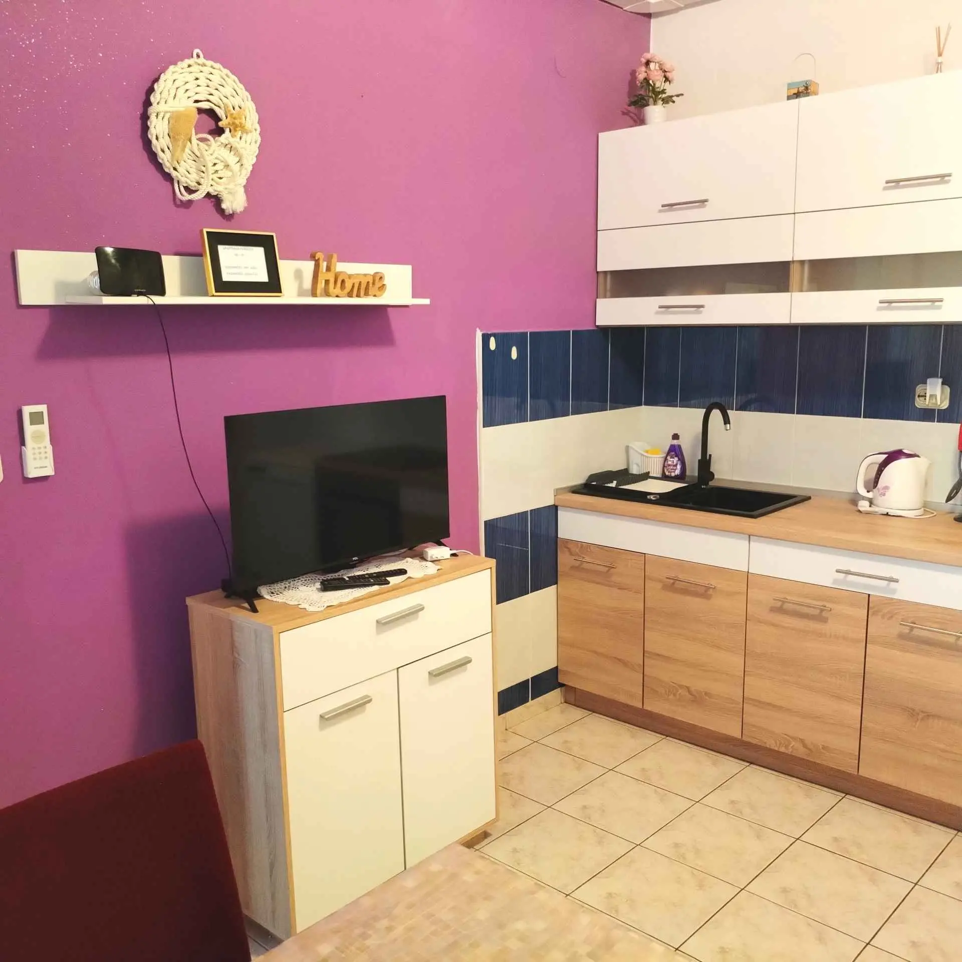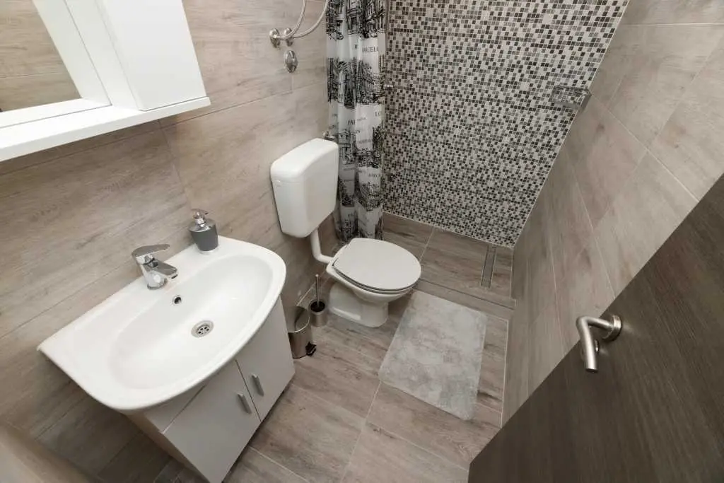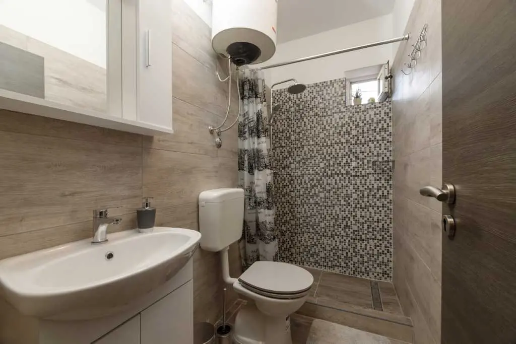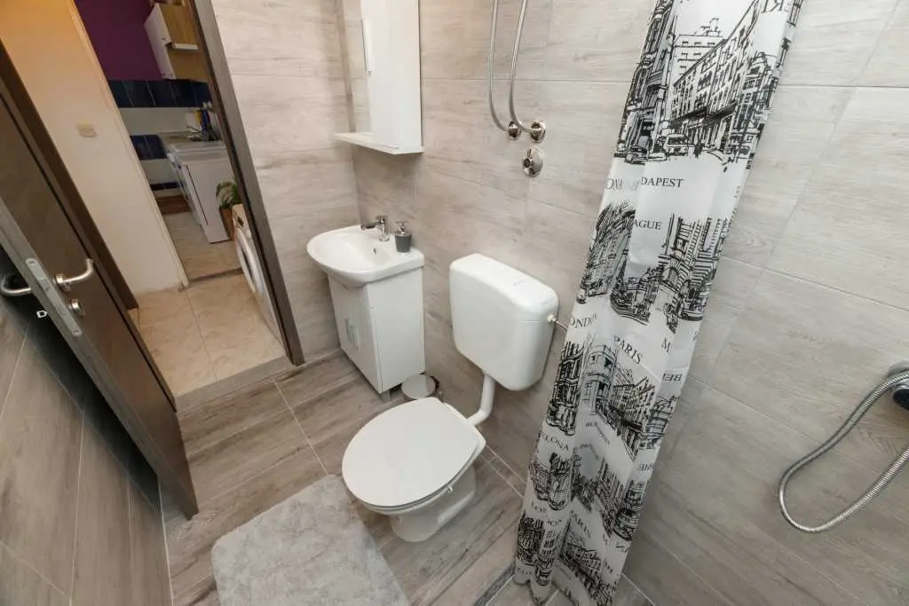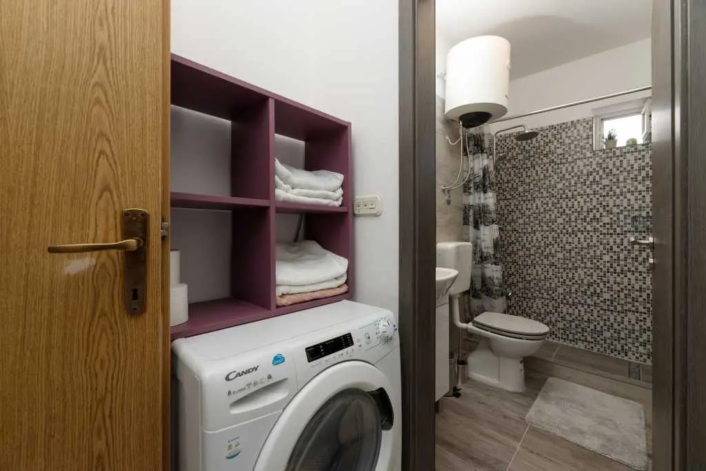 Jednopokojový apartmán Pandula na ostrově Tkon Pašman, 2+2 osoby, má dvoulůžkovou postel v pokoji a pohovku v jídelně, plus jednu extra, 20 m od pláže, terasa s výhledem na moře, pračka a myčka, trouba v kuchyně, soukromé parkoviště, klimatizace, gril, wi-fi, je to v přízemí.
