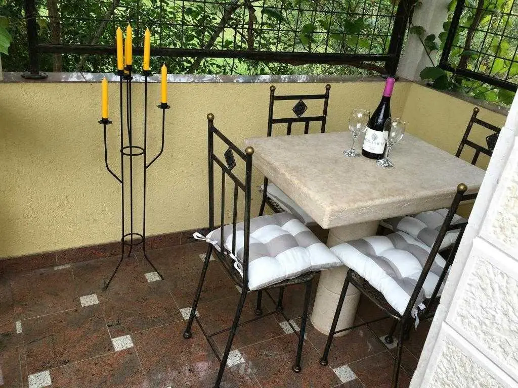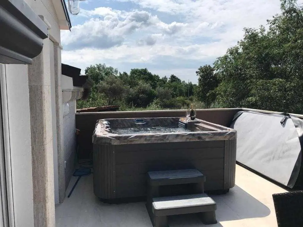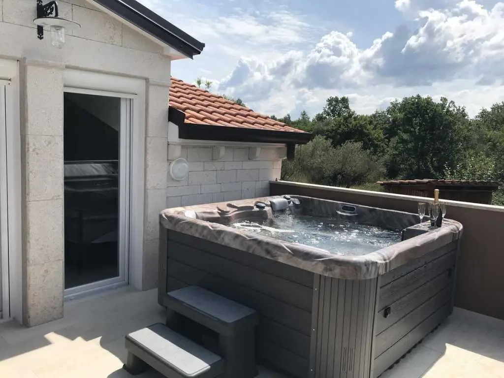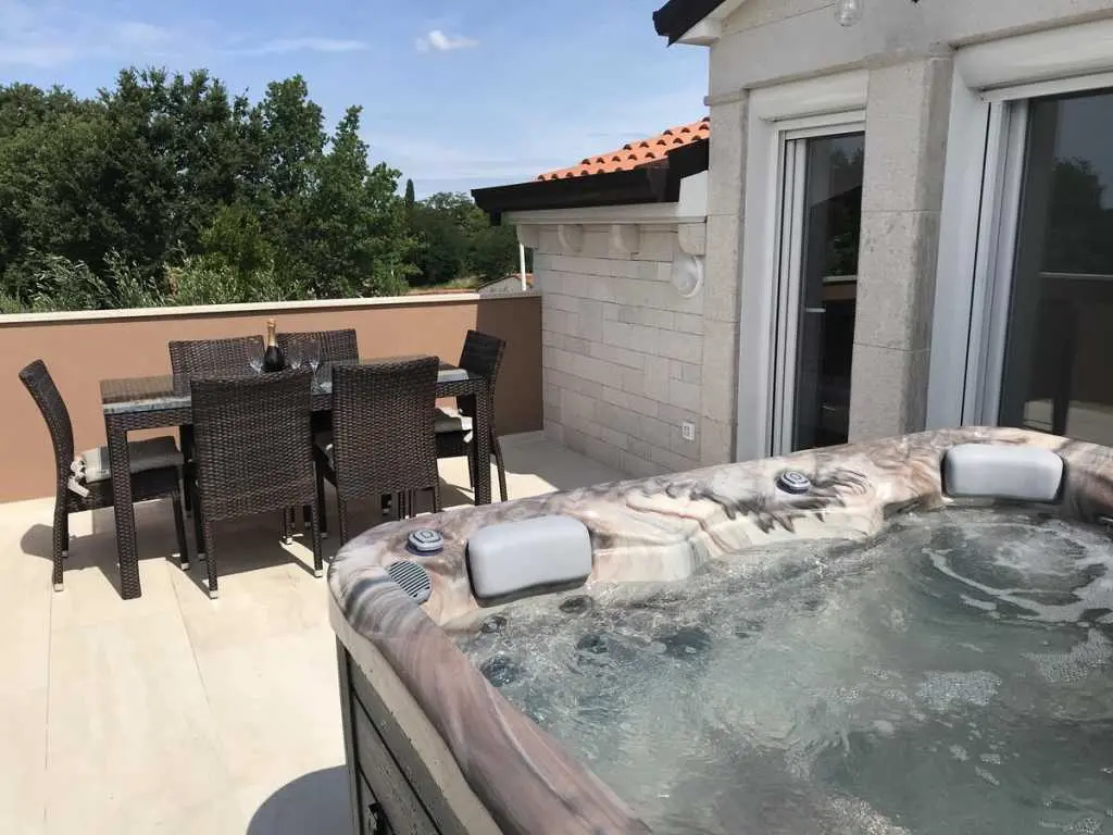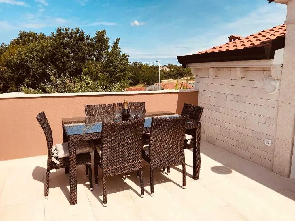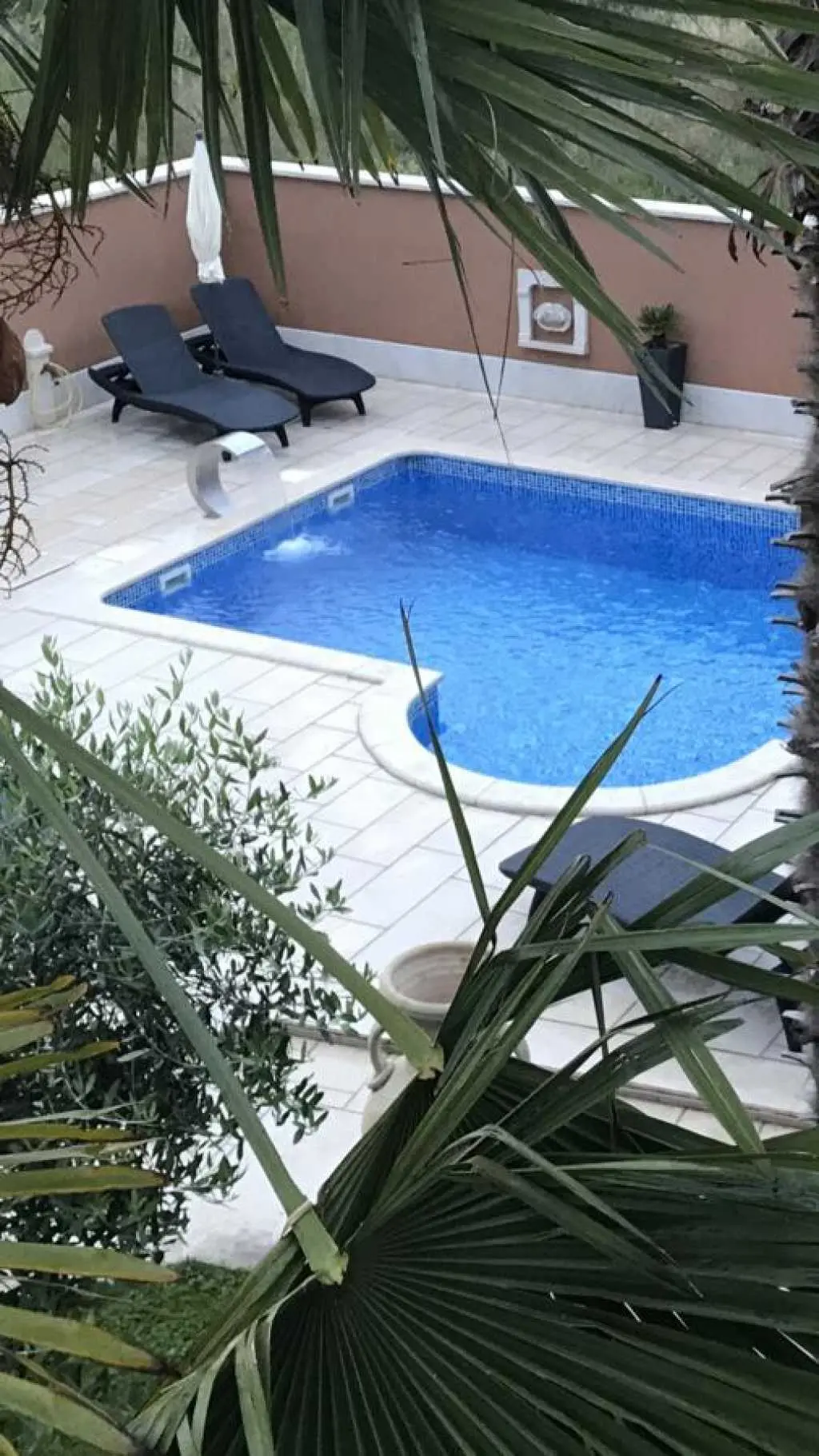 V bytě je kuchyň s jídelním koutem, obývací pokoj, jedna ložnice, koupelna a terasa. Nedaleko je velký gril a bazén o velikosti 7x3, 5 m2 s pláží, lehátky a obklopený zelení. Apartmán v ceně klimatizace, wifi, parkovací místo, kulečníkový stůl, stolní fotbal.
