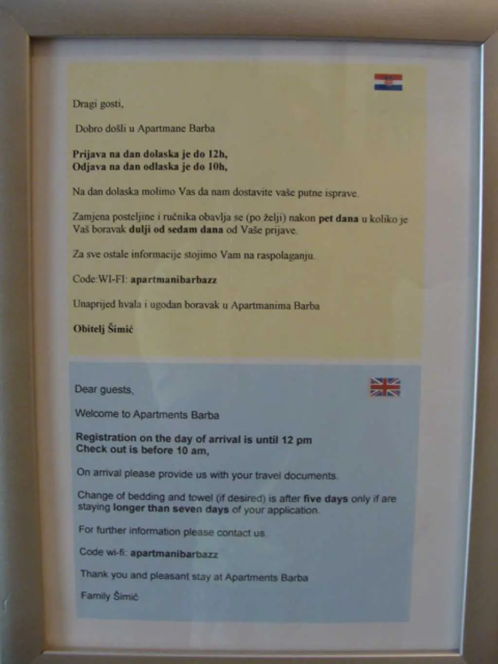 Barba apartmány jsou umístěny v rodinném domě v malé a krásných turistických míst Tučepi, 50 m od moře v blízkosti obchodů, sportovišť, hřišť a restaurací. Tyto apartmány jsou pohodlné a nově zařízené a mají oddělenou ložnici, obývací pokoj, kuchyň, balkon a použití WC. Můžete použít satelitní TV, klimatizace, Wi-Fi a parkování před budovou. Také nabízíme pokoje s využitím kuchyní, klimatizací, Wi-Fi, TV, balkon, terasa a parkoviště. Přijít a strávit svou dovolenou v příjemné atmosféře.