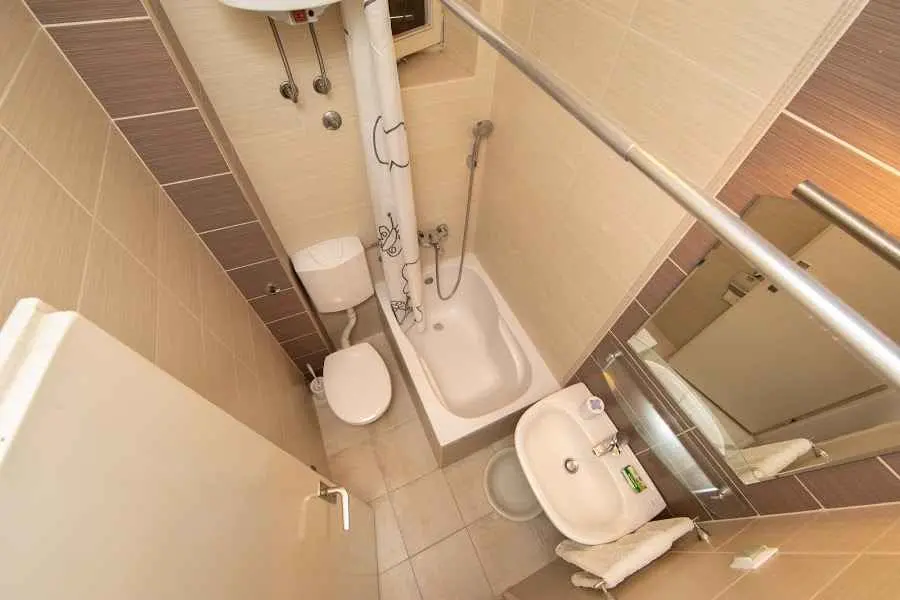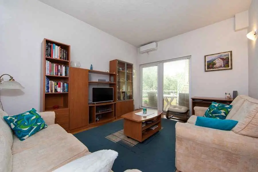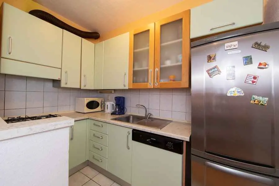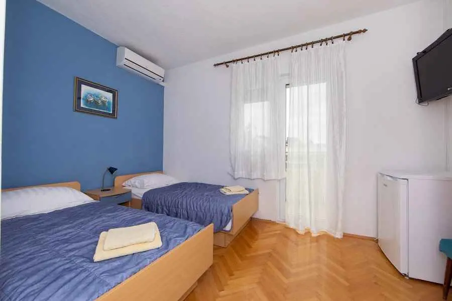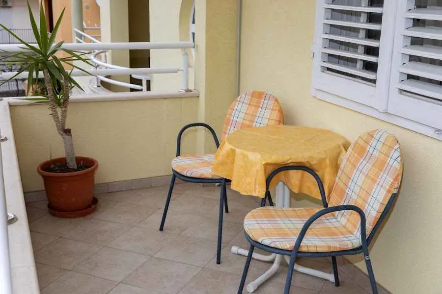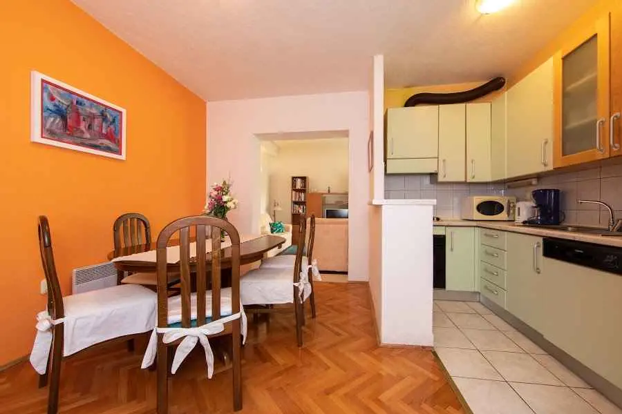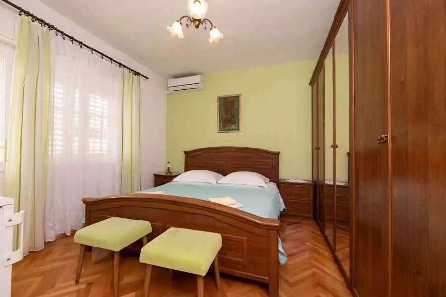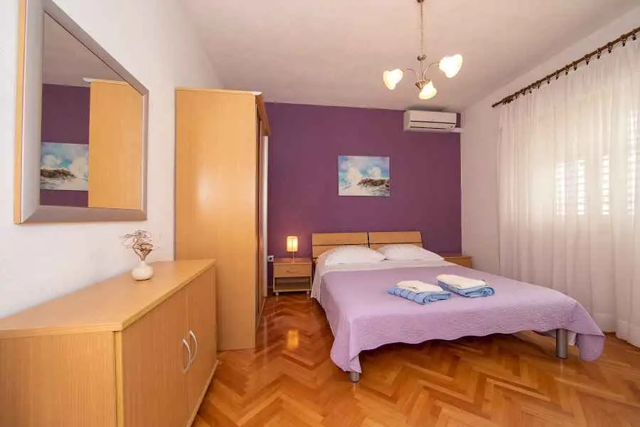 Dům se nachází v samém centru města, vedle krásné oblázkové pláže. Byt se nachází v prvním patře. Obsahuje 3 pokoje, kuchyň, jídelnu a obývací pokoj. Každý pokoj má vlastní koupelnu a balkon. Každý pokoj je vybaven TV a klimatizací. Ve dvoře domu je parkoviště.