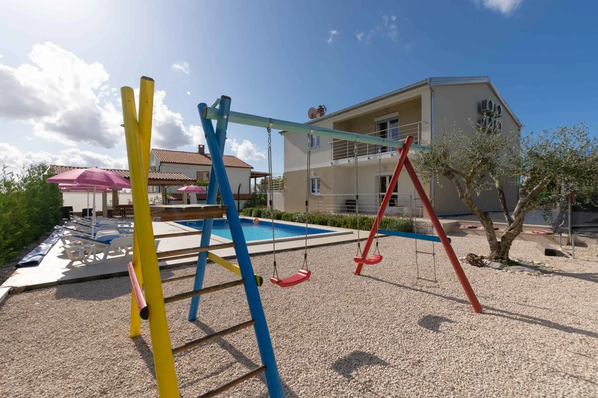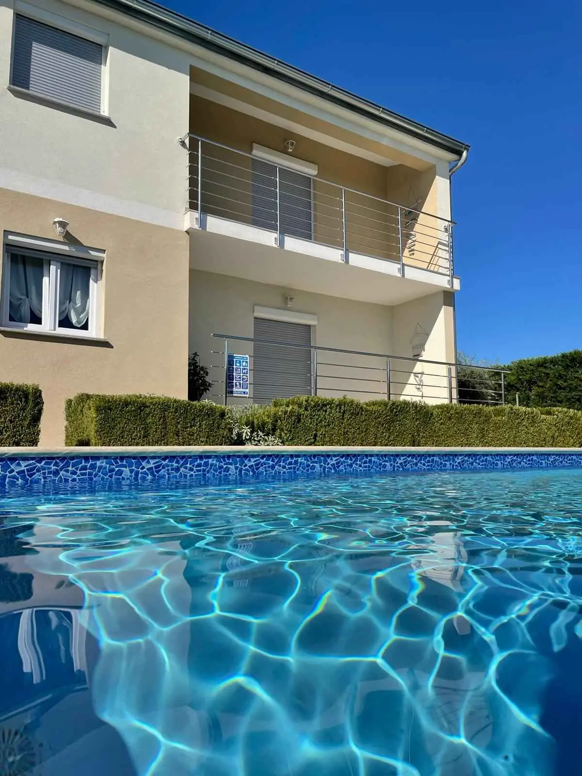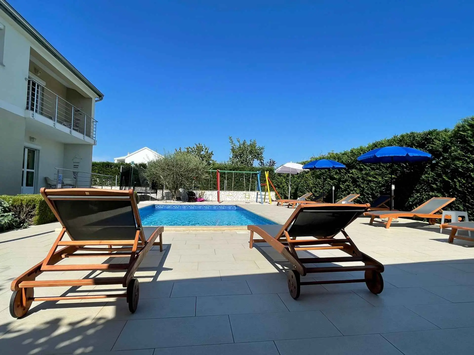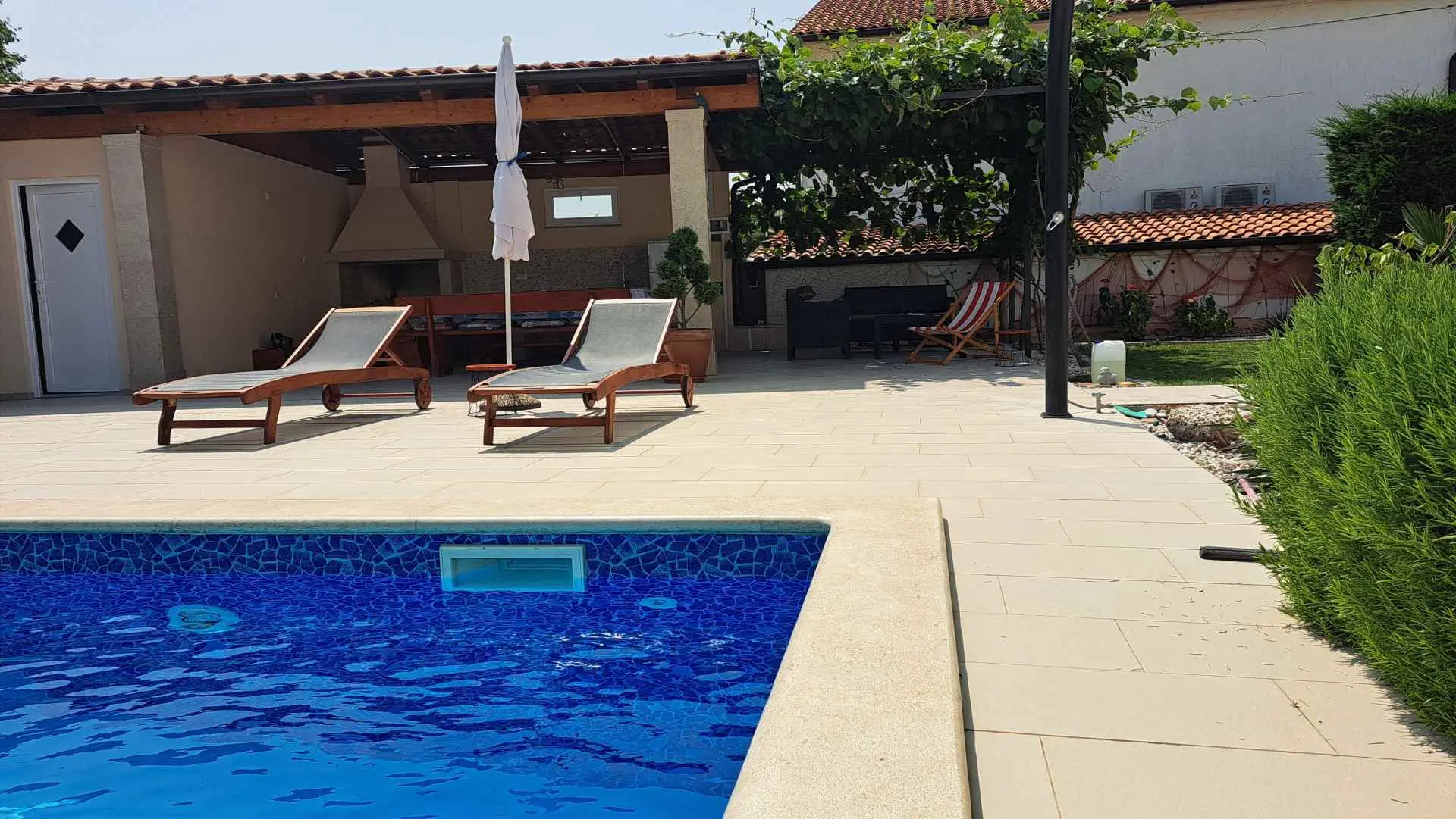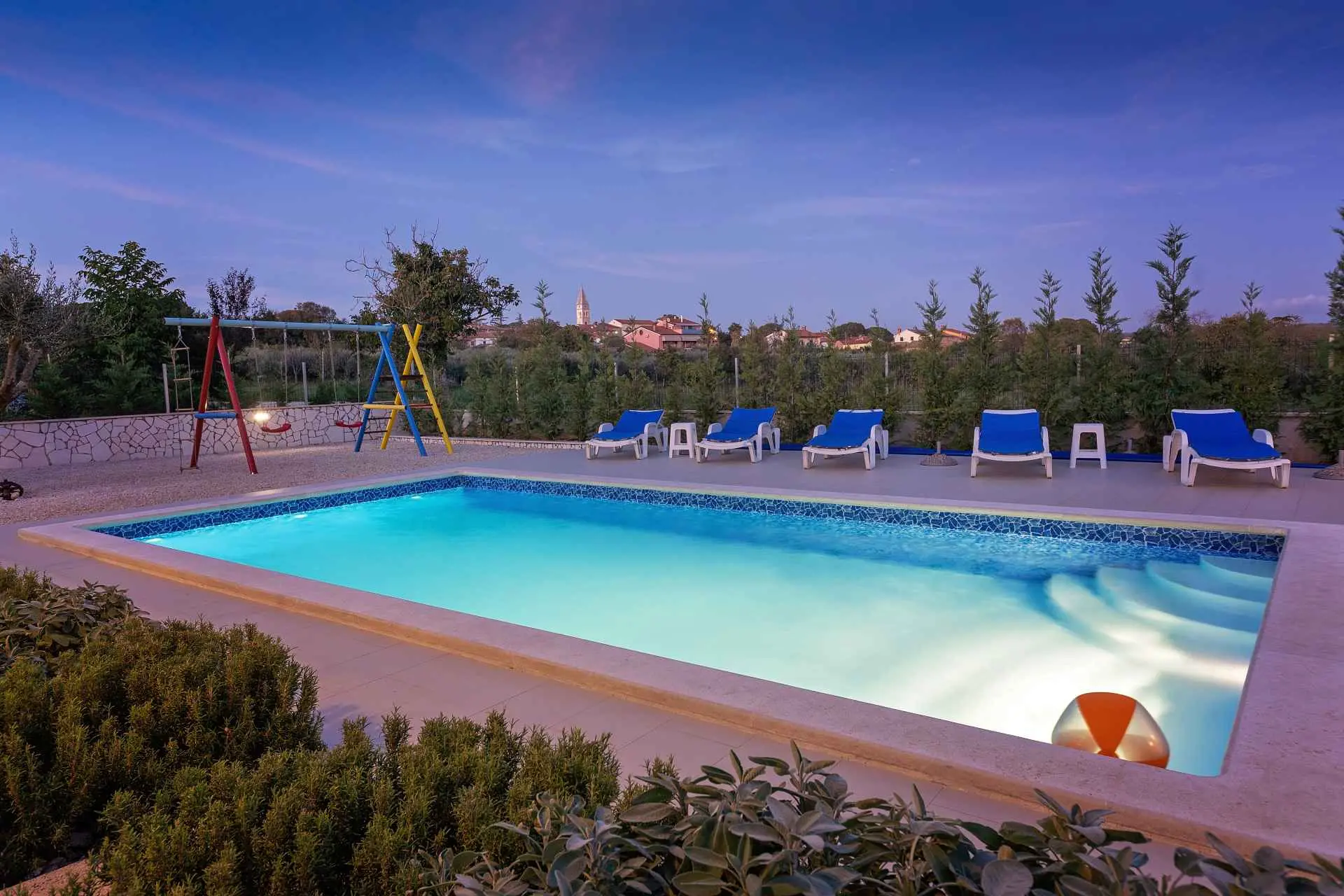 Dům se nachází v malém klidném městečku Kaštelir, pouhých 8 km od Poreče. Dům se skládá ze 2 apartmánů, každý má svůj vchod, takže je vhodný pro 2 rodiny, dvůr je společný a skvělý pro socializaci. Dům se pronajímá jako celek. Každý apartmán se skládá z kuchyně, obývacího pokoje a 2 ložnic. Každý pokoj má svou koupelnu, jak v prvním patře, tak v přízemí, s jedním dalším WC v přízemí. Dvůr je kompletně oplocený. K dispozici máte vlastní bazén 8m x 4m, trampolínu, dětské hřiště, venkovní terasu s grilem a 4 parkovací místa, z toho dvě krytá. Ideální místo pro strávení dovolené s dětmi. Večírky nejsou povoleny.