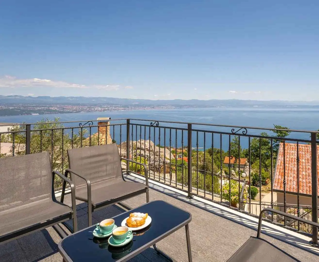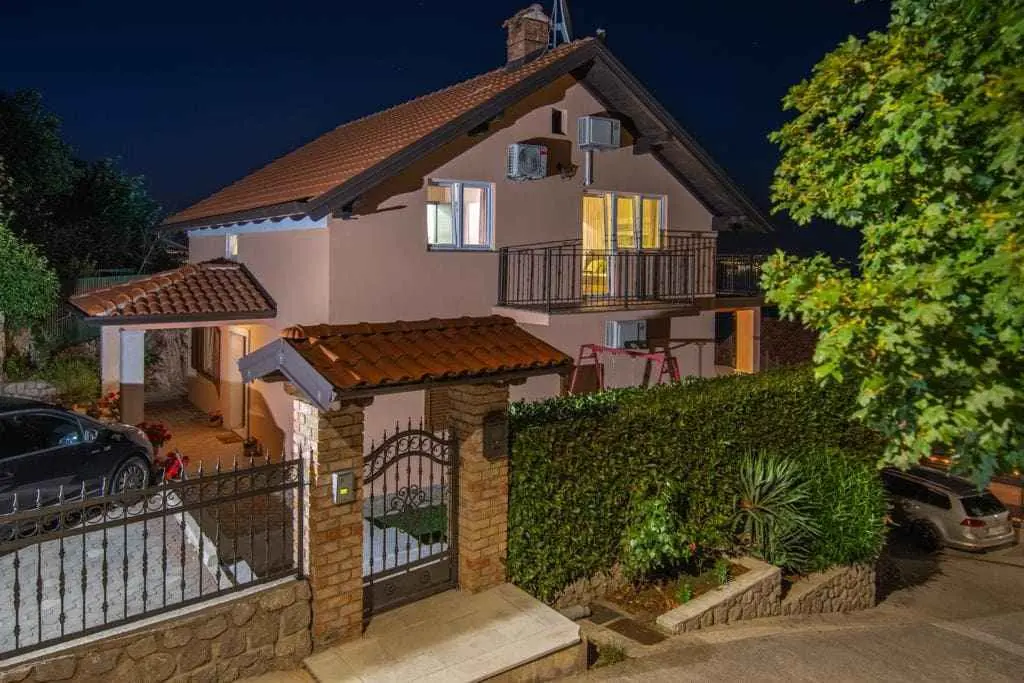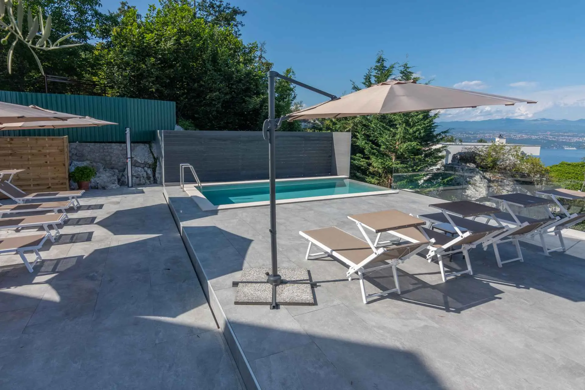 6-pokojový dům 145 m2 na 2 podlažích. Obývací pokoj/jídelna s 1x pohovka pro 1 osobu (100 cm, v délce 210 cm), kabelová TV a klimatizace. Vstup na terasu. 1x pokoj s 1 franc. s postelí (160 cm, délka 200 cm). 1x pokoj s 1x lůžko (90 cm, v délce 200 cm). Otevřená kuchyně (trouba, myčka, 4 indukční desky, rychlovarná konvice, mikrovlnka, mraznička, elektrický kávovar). Sprcha/bidet/WC. V horním patře: (venkovní schodiště) obývací pokoj/jídelna s 1x pohovka (100 cm, v délce 200 cm), kabelová TV a klimatizace. Vstup na balkon. 1x pokoj s 1 franc. postel (160 cm, délka 200 cm), klimatizace. 1x pokoj s 1x lůžko (90 cm, v délce 200 cm). Otevřená kuchyně (trouba, myčka, 4 indukční desky, mikrovlnka, mraznička). Vana/bidet/WC. Bez topení. Balkon 27 m2, balkon 4 m2, velká terasa 75 m2 (částečně zastřešená). Sedací souprava, balkonový nábytek, lehátka. Pěkný panoramatický výhled na moře. K dispozici: trezor, vysoušeč vlasů. Internet (bezdrátová LAN [WLAN], zdarma). Doplňující informace: vhodné pro rodiny s dětmi. Hasicí přístroj. Rodinný dům "Zgodić", na 2 podlažích. Nad Lovranem, osada Liganj, 4 km od centra Lovran, 8 km od centra Opatija, klidná, slunná, vyvýšená poloha, 4,5 km od moře, ve slepé ulici. K soukromému využití: pozemek 510 m2 (oplocený), zahrada - květiny, obdélníkový bazén (6 x 3 m, hloubka 140 cm, sezónní dostupnost: 1. května - 15. listopadu). Venkovní sprcha, terasa (120 m2), zahradní nábytek, gril, dětské hřiště (houpačka). V domě: přístup na internet, pračka. Parkování (pro 3 auta) u domu na pozemku. Obchod 200 m, supermarket 5 km, restaurace 4 km, oblázková pláž 4.5 km, betonová pláž 4.5 km. Marina 5 km, od domu pěšiny 20 m, cyklostezka 30 m. V blízkosti: Přírodní park Učka 200 m.
