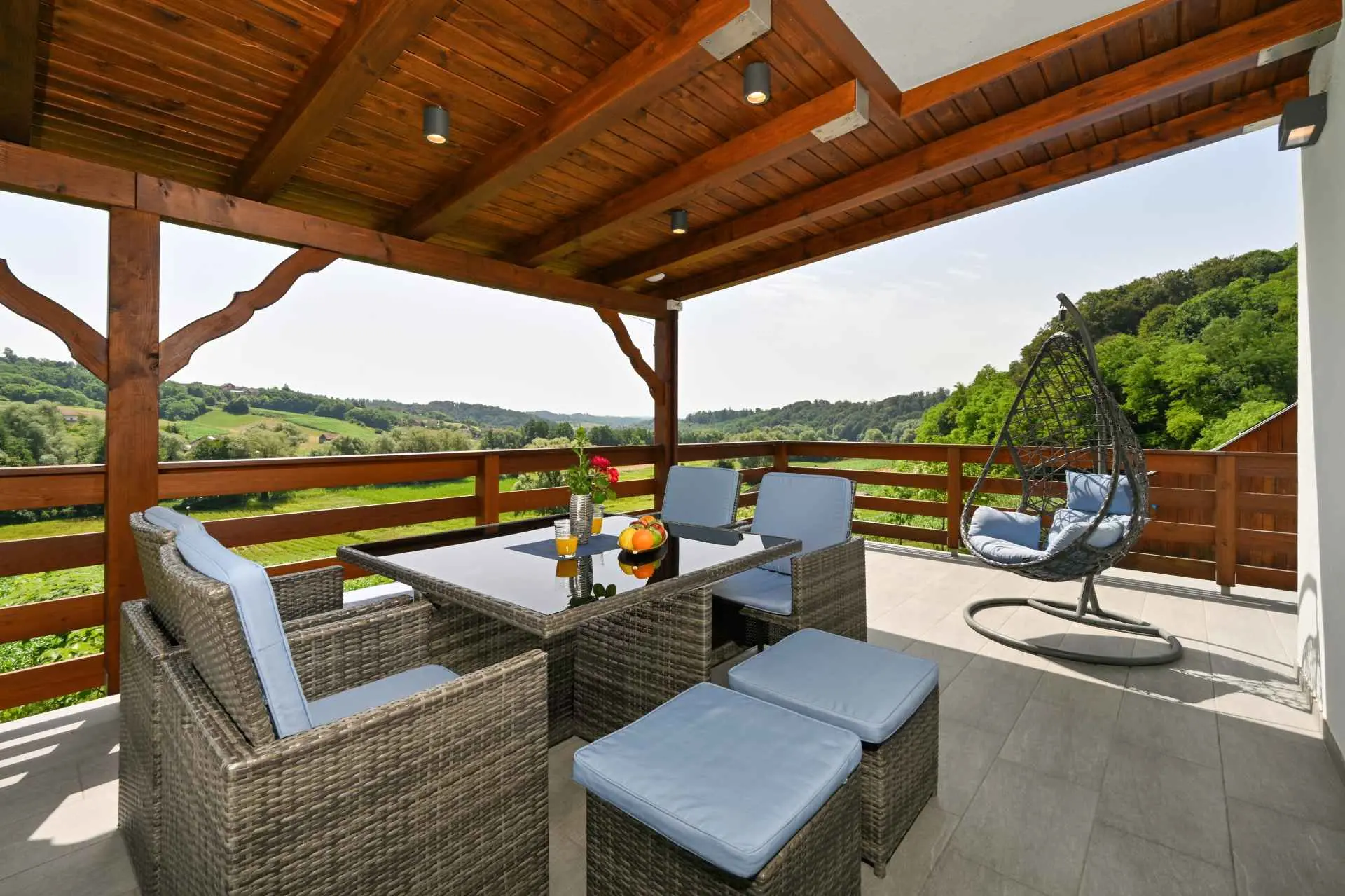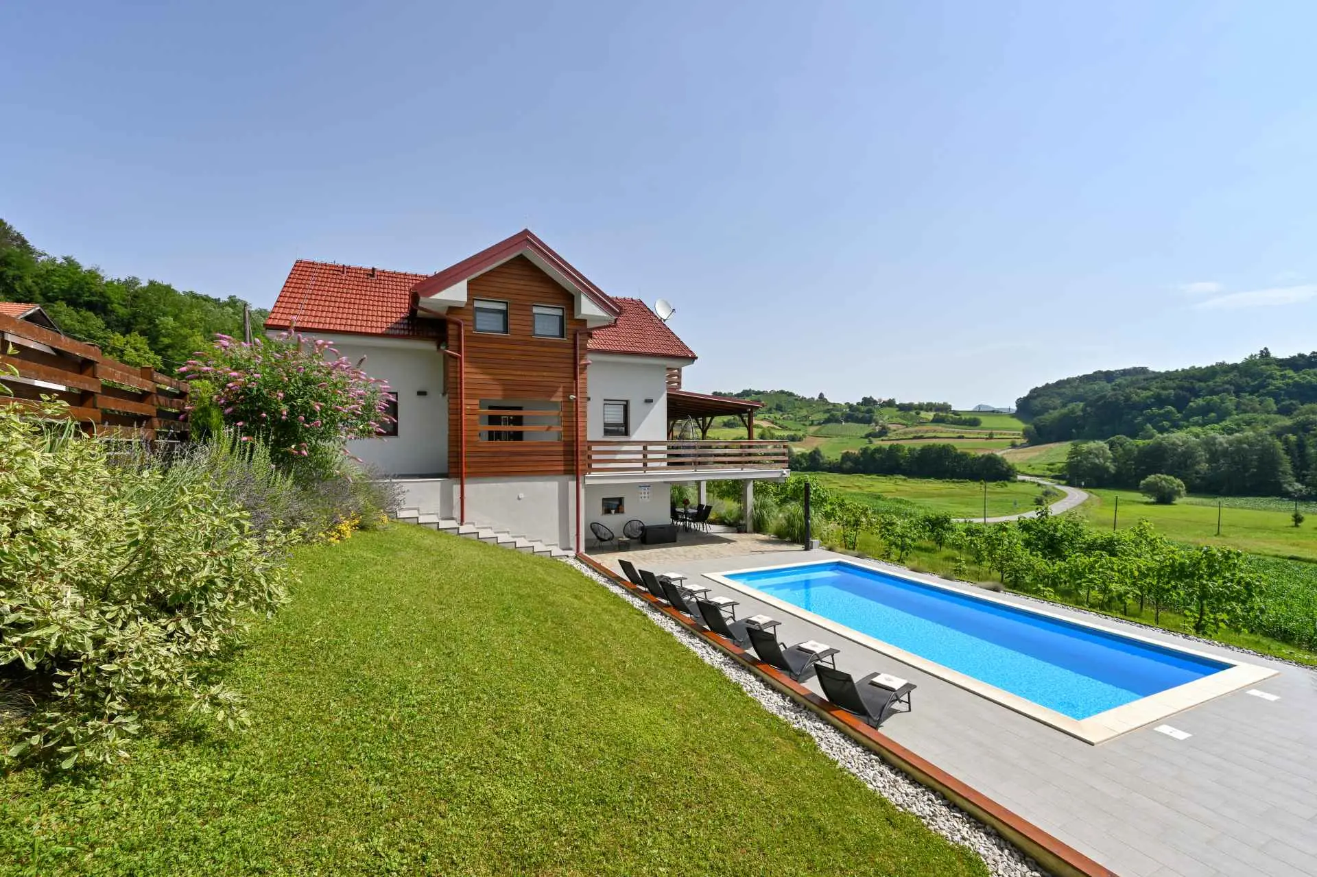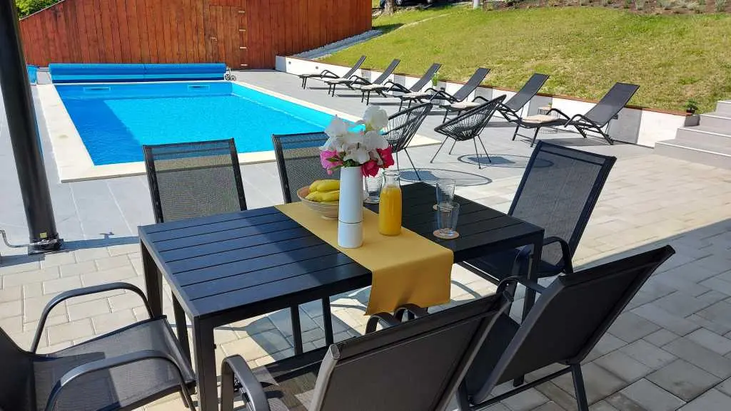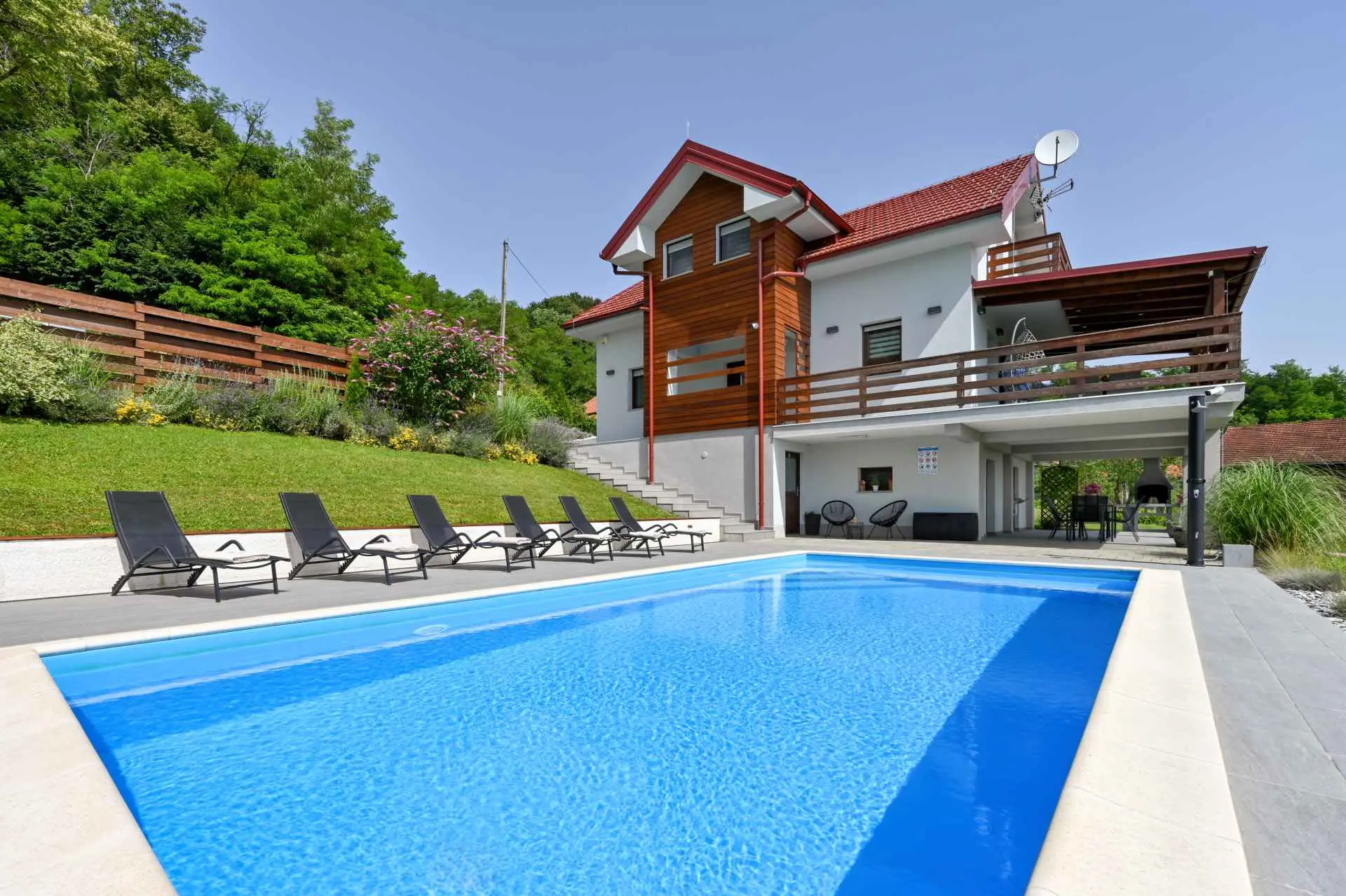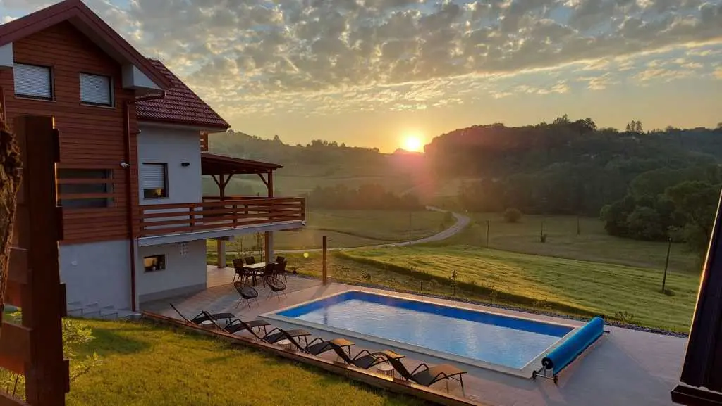 Tento neuvěřitelný dům se nachází na jednom z mnoha kopců krásného Zagorje. Obklopen kopci, vinicemi. ovocný sad a lesy, je ideálním místem pro pohodovou dovolenou v přírodě. Krásný výhled vám umožní vychutnat si krásné východy slunce - odtud také pochází název domu. Sunrise Hill byl zařazen do kategorie 4* a nabízí útulné ubytování pro 8 osob. Orientuje se především na rodiny s dětmi. Je ideální pro klidnou dovolenou nebo společenský život, ale také pro rekreaci a sport. S prostředím, které nabízí velký bazén se sprchou a terasou, venkovní vířivku, gril, domeček na hraní, parkovací místo, dům zdobí pečlivě vybraný interiér, ve kterém převládá dřevo a světlé, uklidňující tóny. Dům se skládá z přízemí s prostorným obývacím pokojem, jídelnou, kuchyní, koupelnou a hernou pro děti se stolním fotbalem, PlayStation 4, deskovými hrami. K dispozici je také velká terasa, která vyzývá k posezení a kochání se výhledem. V patře jsou tři ložnice, koupelna, další WC, sauna a balkon. Dům splňuje všechny potřeby moderního hosta. Sunrise Hill se nachází asi 50 km od Záhřebu a 1,5 km od centra Pregrady, jednoho z nejkrásnějších městeček v Zagorje. Svou dovolenou můžete doplnit spoustou obsahu, který Zagorje nabízí. Můžete si vybrat z různých muzeí, zámků proměněných v muzea, kulturních památek, lázní s léčivými prameny, spousty gastronomických požitků ve špičkových restauracích i vinařstvích a různých sportovních aktivit. Každý host bude přivítán speciálním dárkem na uvítanou typickým pro Zagorje! Vítejte v Zagorje - v pohádce na dosah ruky, v kraji pro odpočinek duše i těla, vítejte na Sunrise Hill!