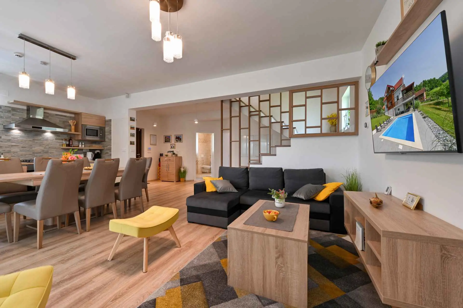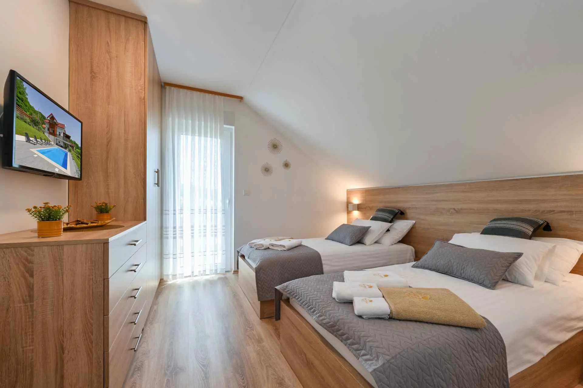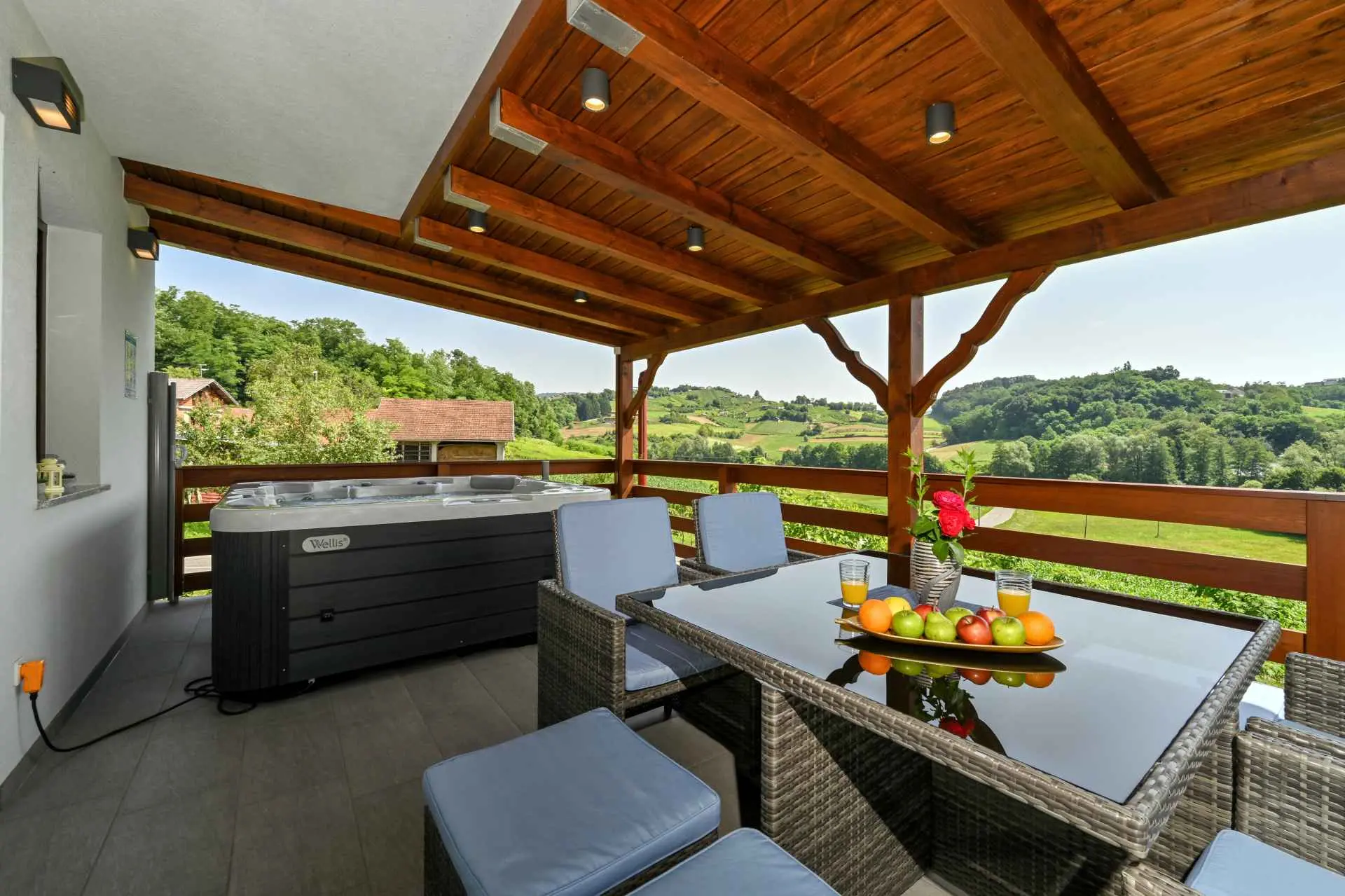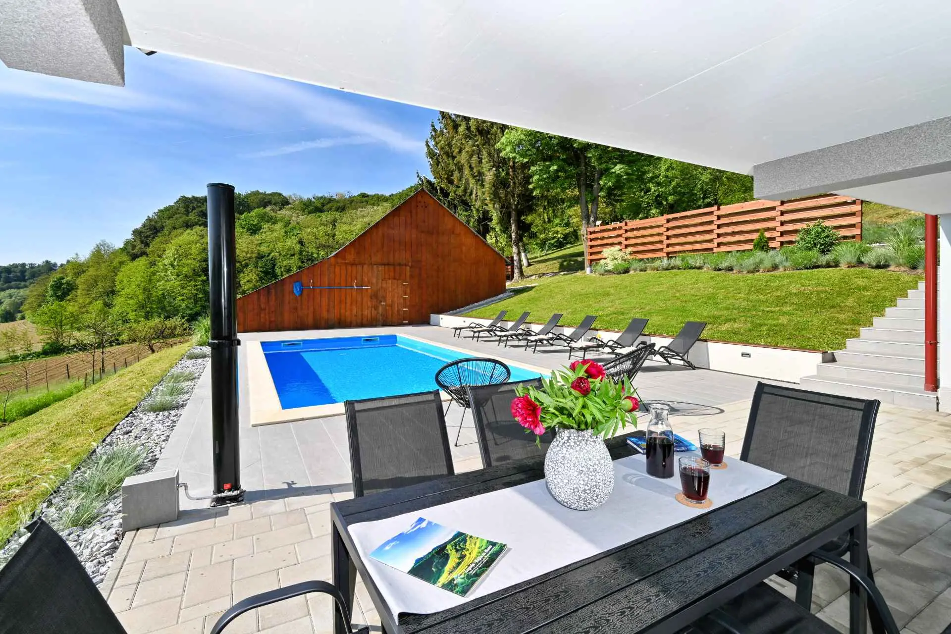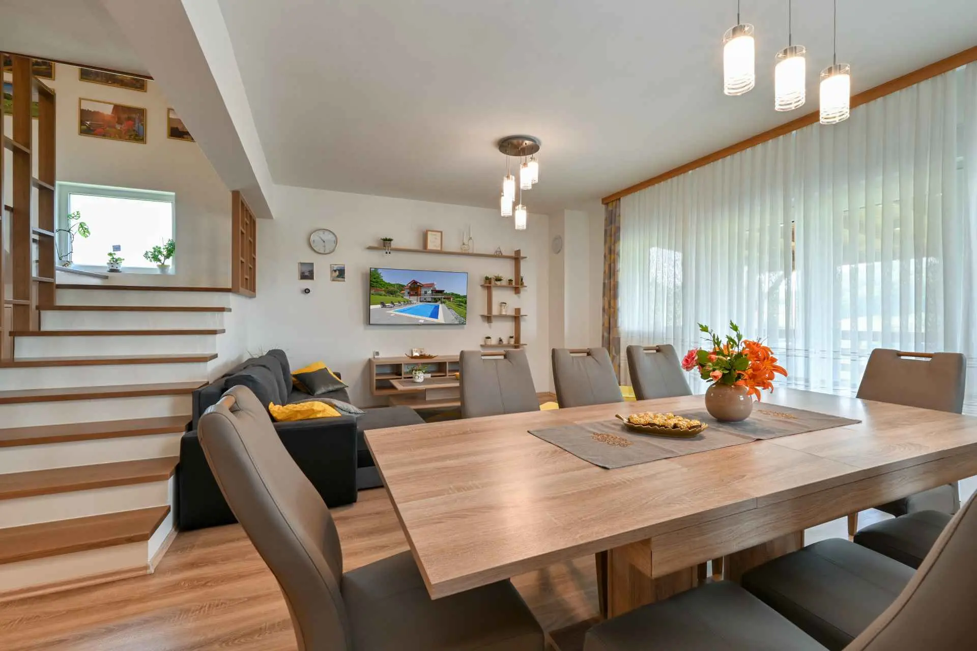 Tento neuvěřitelný dům se nachází na jednom z mnoha kopců krásného Zagorje. Obklopen kopci, vinicemi. ovocný sad a lesy, je ideálním místem pro pohodovou dovolenou v přírodě. Krásný výhled vám umožní vychutnat si krásné východy slunce - odtud také pochází název domu. Sunrise Hill byl zařazen do kategorie 4* a nabízí útulné ubytování pro 8 osob. Orientuje se především na rodiny s dětmi. Je ideální pro klidnou dovolenou nebo společenský život, ale také pro rekreaci a sport. S prostředím, které nabízí velký bazén se sprchou a terasou, venkovní vířivku, gril, domeček na hraní, parkovací místo, dům zdobí pečlivě vybraný interiér, ve kterém převládá dřevo a světlé, uklidňující tóny. Dům se skládá z přízemí s prostorným obývacím pokojem, jídelnou, kuchyní, koupelnou a hernou pro děti se stolním fotbalem, PlayStation 4, deskovými hrami. K dispozici je také velká terasa, která vyzývá k posezení a kochání se výhledem. V patře jsou tři ložnice, koupelna, další WC, sauna a balkon. Dům splňuje všechny potřeby moderního hosta. Sunrise Hill se nachází asi 50 km od Záhřebu a 1,5 km od centra Pregrady, jednoho z nejkrásnějších městeček v Zagorje. Svou dovolenou můžete doplnit spoustou obsahu, který Zagorje nabízí. Můžete si vybrat z různých muzeí, zámků proměněných v muzea, kulturních památek, lázní s léčivými prameny, spousty gastronomických požitků ve špičkových restauracích i vinařstvích a různých sportovních aktivit. Každý host bude přivítán speciálním dárkem na uvítanou typickým pro Zagorje! Vítejte v Zagorje - v pohádce na dosah ruky, v kraji pro odpočinek duše i těla, vítejte na Sunrise Hill!